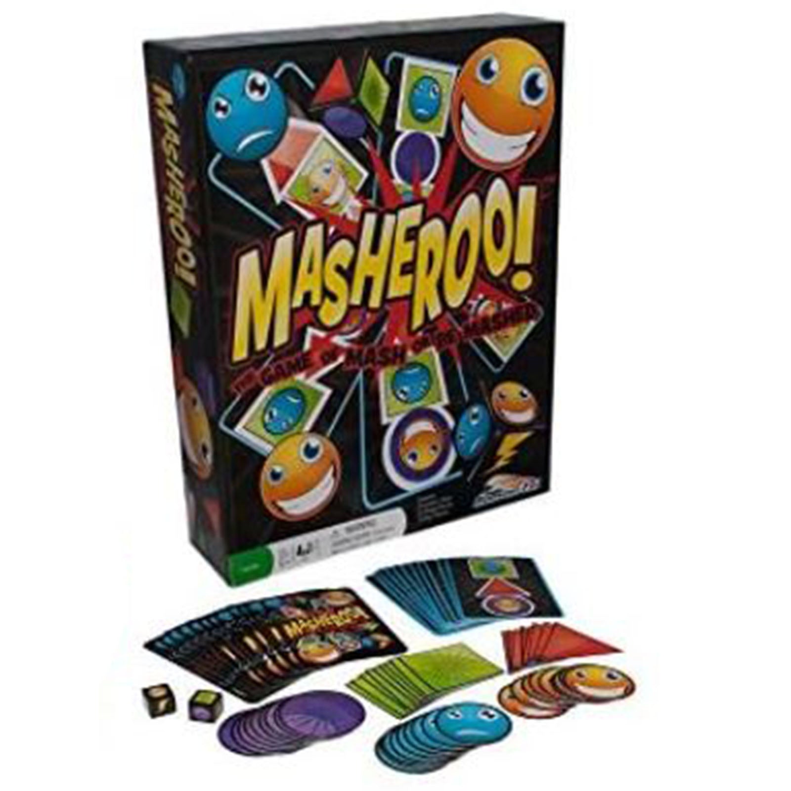 Masheroo!™ is the hilarious game that keeps everyone on their toes! The first player to match their shape and face chips to their pattern card wins! But be ready for the unexpected, the Masher Bolt can mash shapes, leaving no choice but to rebuild. It's the fast paced game of Mash or Be Mashed!